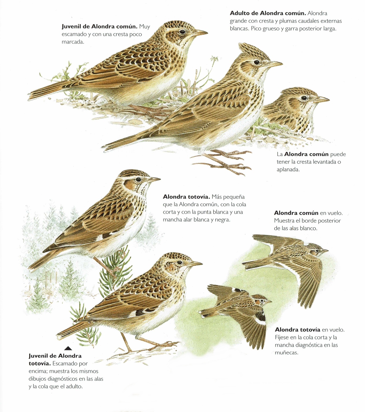Es fácil confundir a la Alondra común o Laverca con la Totovía o Cotovía pequena, esta última mucho menos común en la Ría de Noia, en la siguiente lámina de la Guía de identificación de aves susceptibles de ser confundidas, de la editorial OMEGA, se pueden apreciar perfectamente las pocas diferencias que hay entre ambas especies.