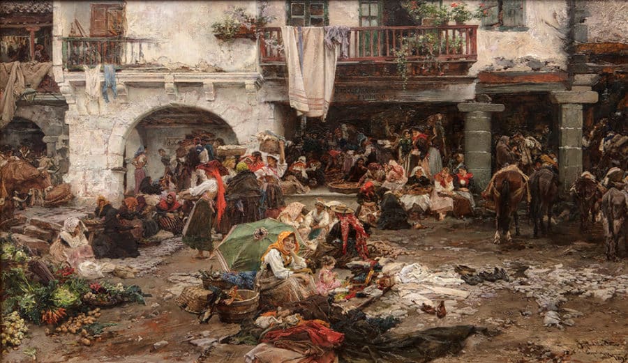 Sólo por puntualizar y contextualizar. Otra maravillosa obra, fruto de equivocaciones, con exactamente el mismo tema, la misma ubicación e incluso de la misma década, pero que desgraciadamente se encuentra en una colección particular, es el Óleo sobre tabla de Francisco Pradilla. Día de mercado en Noia (1895), donde de todo el enorme conjunto de actores de la escena, una minúscula sonrisa atrae y acapara la mirada del observador sin excepción. ¿A que si?