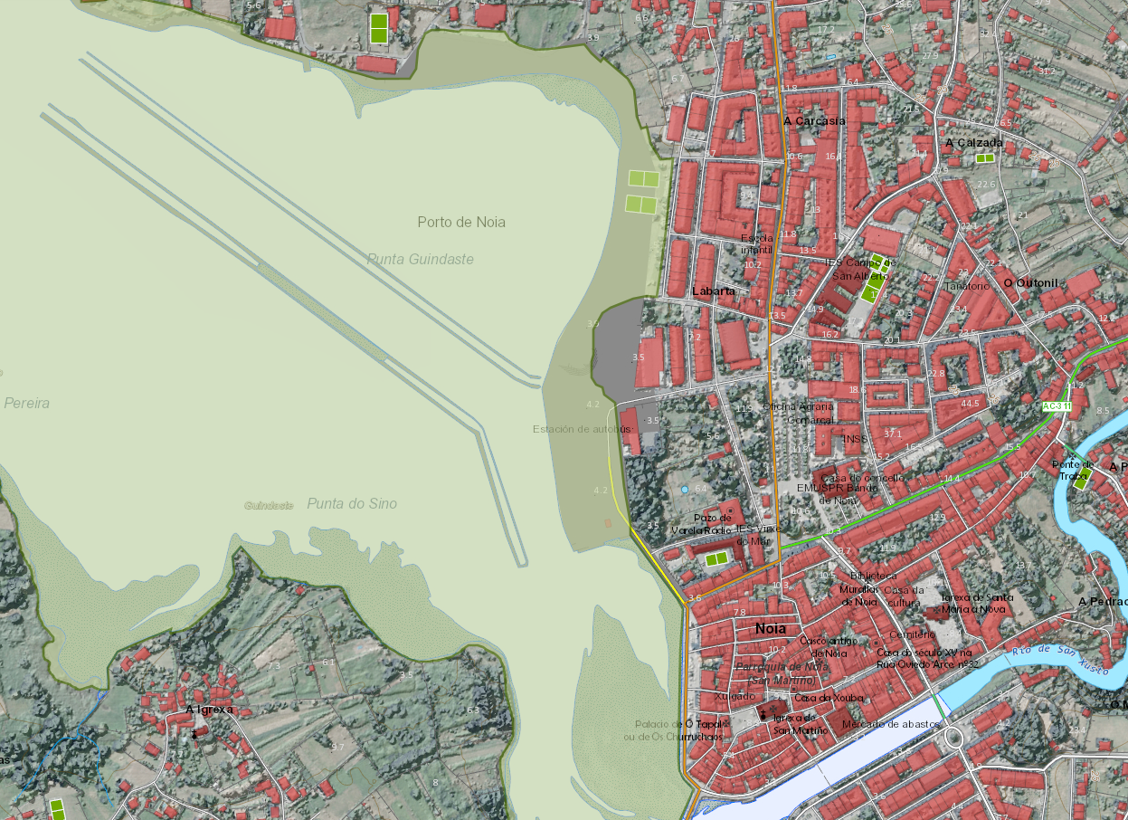Como marca en verde la siguiente imagen extraída del visor oficial de la web de Ordenación e Xestión Integrada do Litoral de Galicia, todo el paseo marítimo, incluida la zona donde se insta a estacionar las autocaravanas, son zonas verdes, y también espacio natural protegido por la Red Natura 2000.